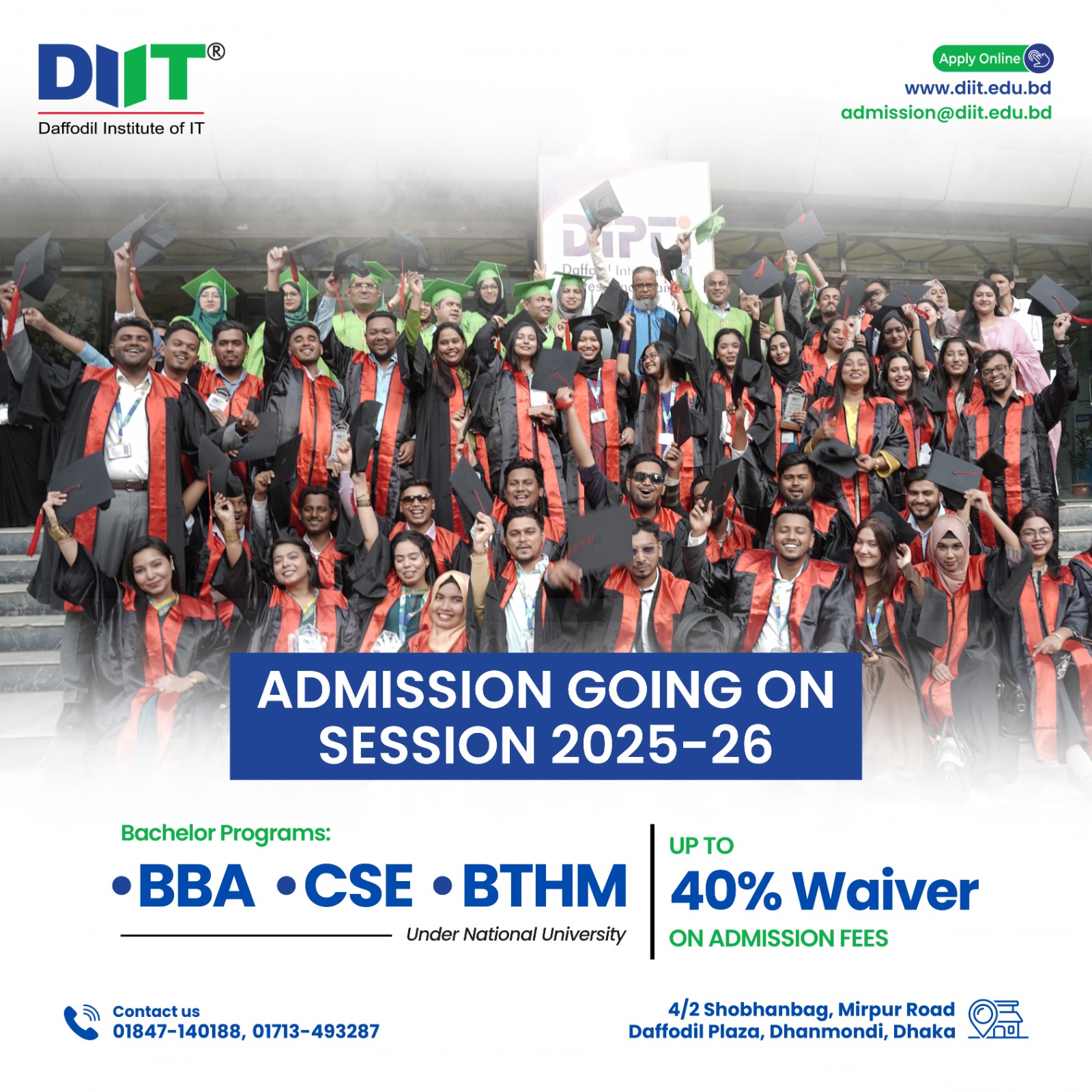 Daffodil Institute of IT (DIIT) is a non-profit private institute located in Dhaka, Bangladesh that offers professional BBA, CSE, BTHM, and MBA programs under the National University. DIIT became affiliated with the National University in 2000 and has since been a leader in computer-based education, offering a unique combination of academic and professional skills in a modern and welcoming environment. DIIT serves students from a variety of social backgrounds from across the country and holds the top position among all institutions under the National University in BBA, CSE, BTHM, and MBA programs.
